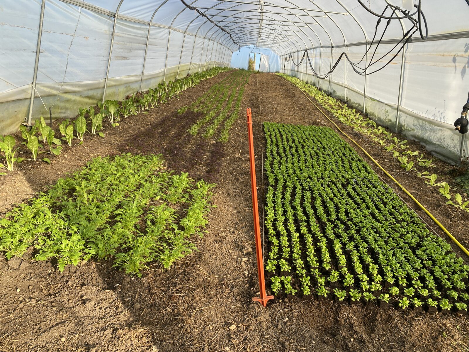 Der grosse Tunnel ist nun fertig bepflanzt. Die Nüsslisalat-Setzlinge sind zugekauft (da es mehr als 1000 sind), alle anderen Setzlinge sind von uns selber angezogen worden. Oberhalb des Nüsslisalats säe ich demnächst Schnittsalat, deshalb ist dort noch leer.