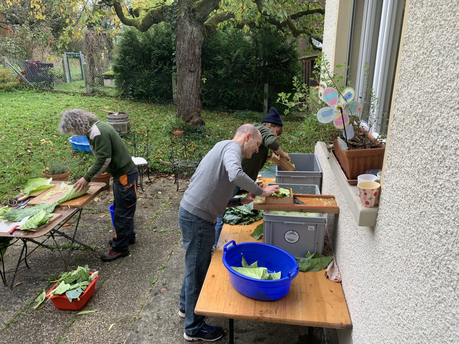 Vergangenen Samstag haben ein paar Mitglieder und ihre Kinder fleissig Sauerkraut gemacht. Die Produktionsstätte war bei Marianne zu Hause, da dort die Bedingungen, sprich die Temperatur für die Gärung ideal sind bzw. ist.