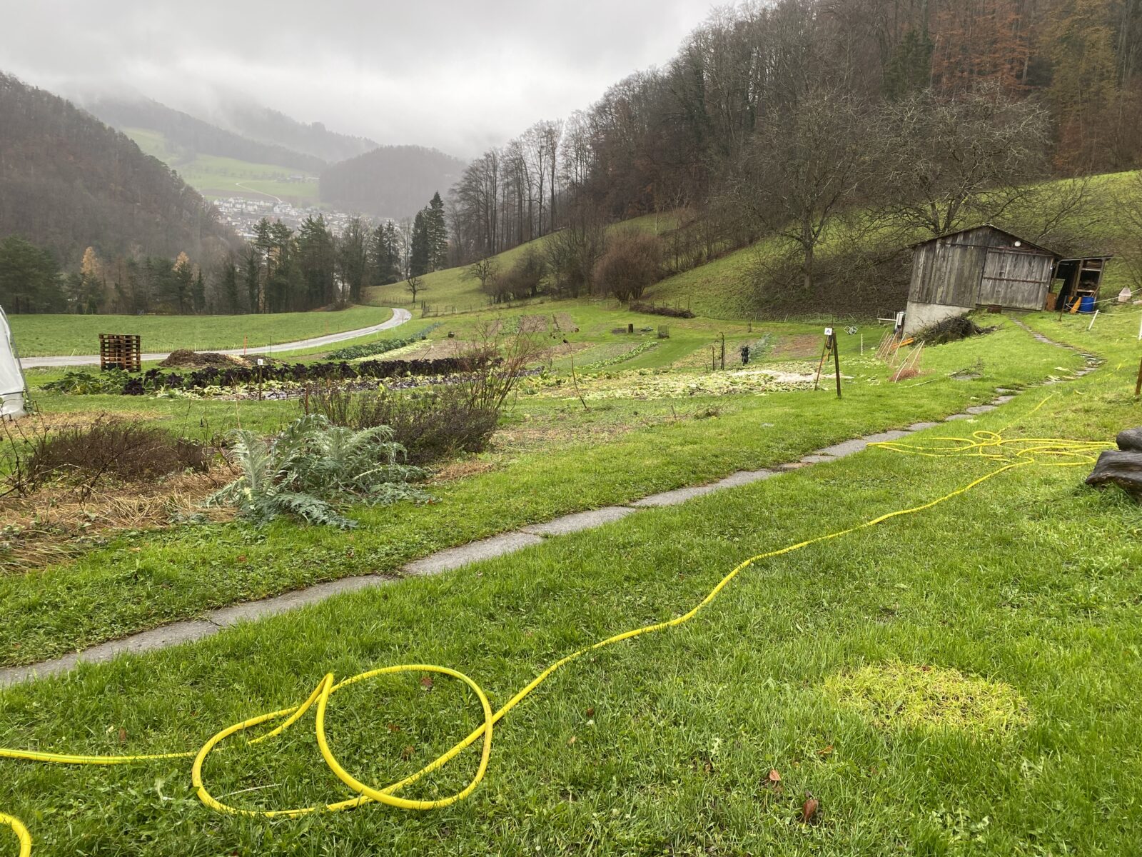 Heute war es definitiv nicht sehr anmächelig im Garten zu arbeiten. Im Tunnel drin mit dem Prasseln der Regentropfen dafür umso gemütlicher. Dort drin gediehen seit Mitte Oktober nicht nur unsere Kulturen wunderbar, sondern auch diverse Beikräuter wie zum Beispiel die Vogelmiere. Ihr könnt Vogelmiere bedenkenlos essen, falls ihr sie zwischen dem Spinat, dem Winterportulak, dem Asiasalat, dem Rucola oder so entdeckt. Damit sie unsere Kulturen nicht zu stark um Licht oder Nährstoffe konkurrieren, hacken wir sie auch weg. Das geschah heute morgen, mit Dankbarkeit etwas im Schärme machen zu können.