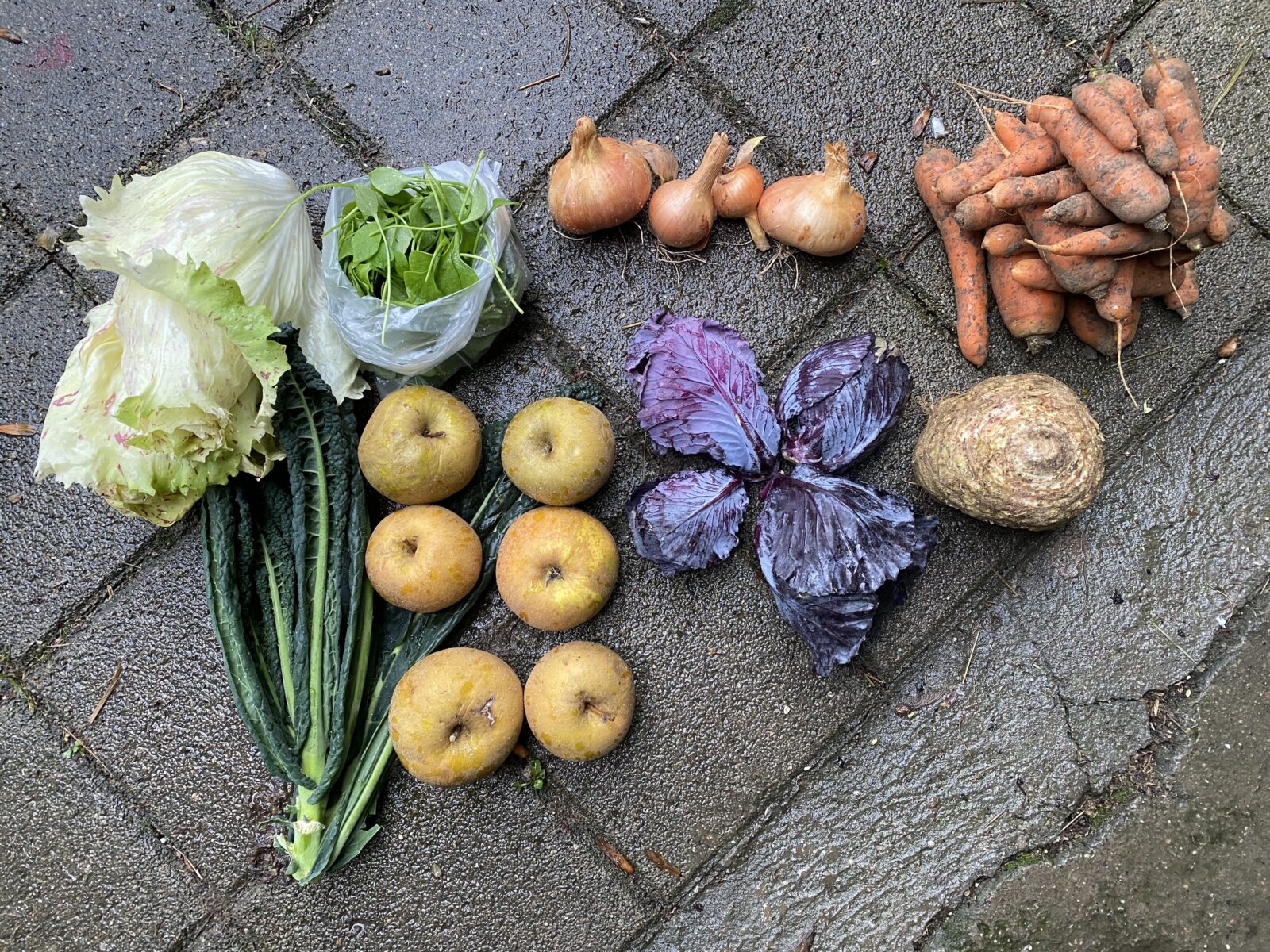 Diese feinen Überraschungen sind heute im Korb: Castelfranco-Salat, im Güggli „Miner’s Lettuce“ (auch bekannt als Kubaspinat oder Winterportulak), Zwiebeln, Rüebli, Knollensellerie, Rotkabis, Boskoop-Äpfel und Palmkohl „Nero di Toscana“.