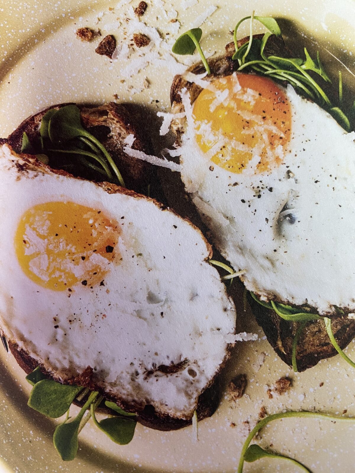 2 Knoblauchzehen in eine Schüssel pressen, 40g weiche Butter beigeben und schaumig schlagen, mit Salz und Pfeffer würzen. 4 Scheiben Brot beidseitig mit der gewürzten Butter bestreichen und in einer beschichteten Bratpfanne beidseitig je etwa 3 Minuten goldbraun braten. Herausnehmen. 4 Eier in etwas Fett zu Spiegeleier braten und mit Salz und Pfeffer würzen. Das geröstete Brot mit dem Portulak belegen, das Ei darauflegen und nach Belieben geriebenen Käse drauf streuen.