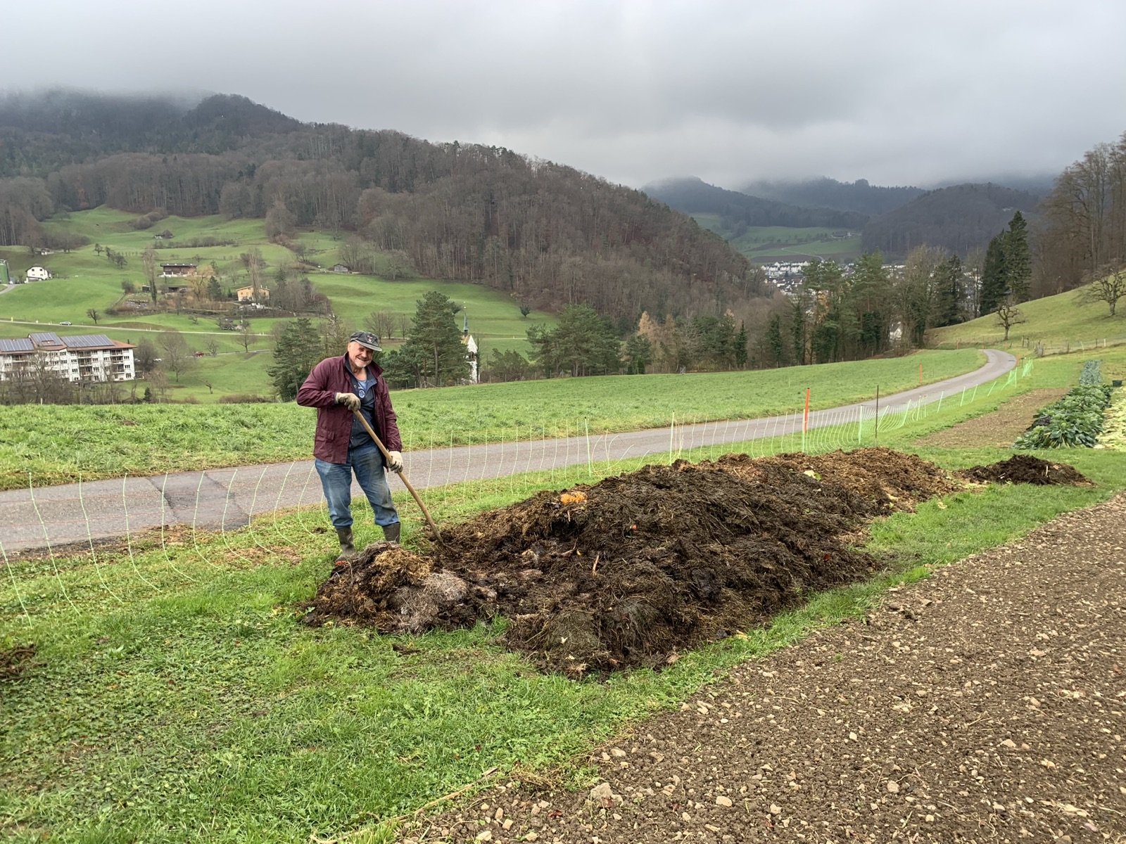 Arthur, unser fleissiger Helfer, hat gestern den Kompost umgegraben. Eine wichtige Arbeit. Immer wieder wird der Haufen bewegt, dadurch entsteht eine gute Durchmischung von Ernterückständen, Gras und Mist. Der Kompost wird durch den Winter von vielen kleinen Tieren zu wertvollem Dünger verarbeitet, welchen wir im Frühling für unsere Kulturen einsetzen können.